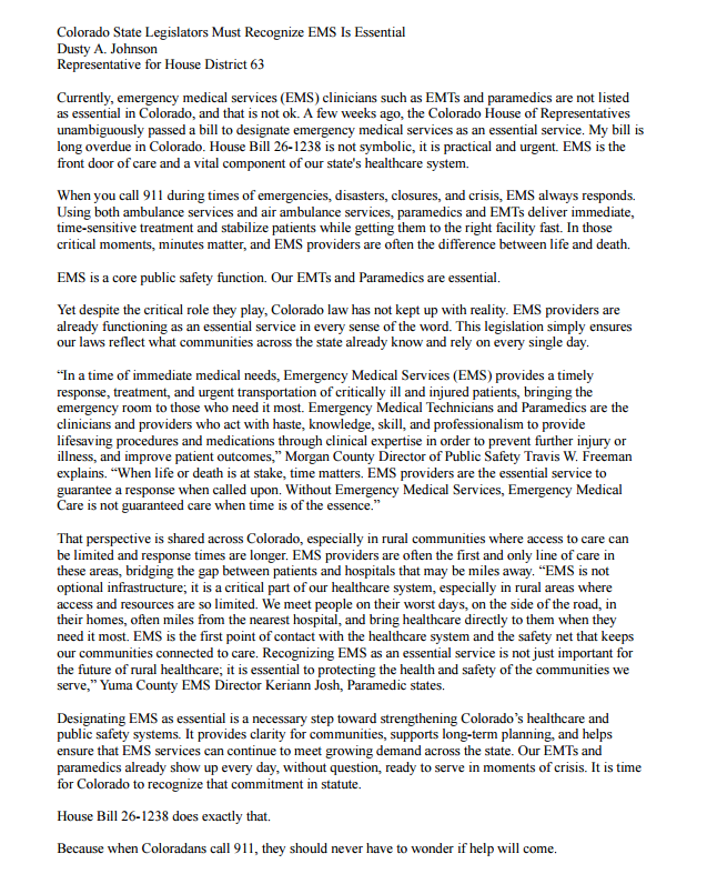 Colorado Politics: Opinion: Colorado State Legislators Must Recognize EMS Is Essential by Dusty Johnson